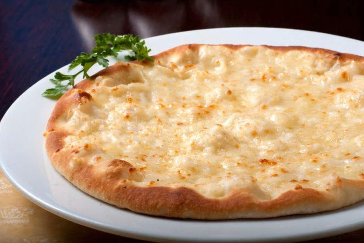 Frisch gebackenes, orientalisches Fladenbrot belegt mit geschmolzenem Käse – ein beliebter Snack aus dem Steinofen.